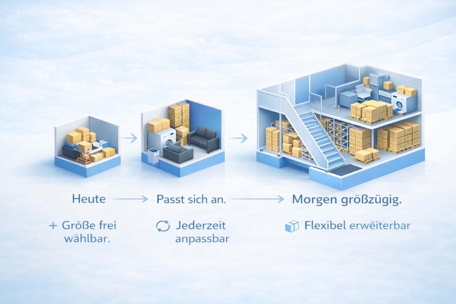 Je nach Anforderung stehen unterschiedliche Lagergrößen zur Verfügung. Kleine Boxen eignen sich für Kartons und Dokumente, mittlere Einheiten für Möbel und Hausrat, größere Flächen für gewerbliche Nutzung oder umfangreiche Warenlager.